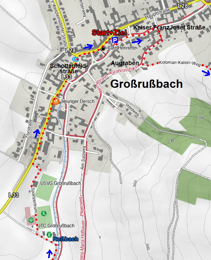 Start und Ziel: Parkplatz in der Kaiser Franz Josef Straße, gegenüber Nr. 23 (westlich des Gemeindezentrums beim Sparkassengebäude).