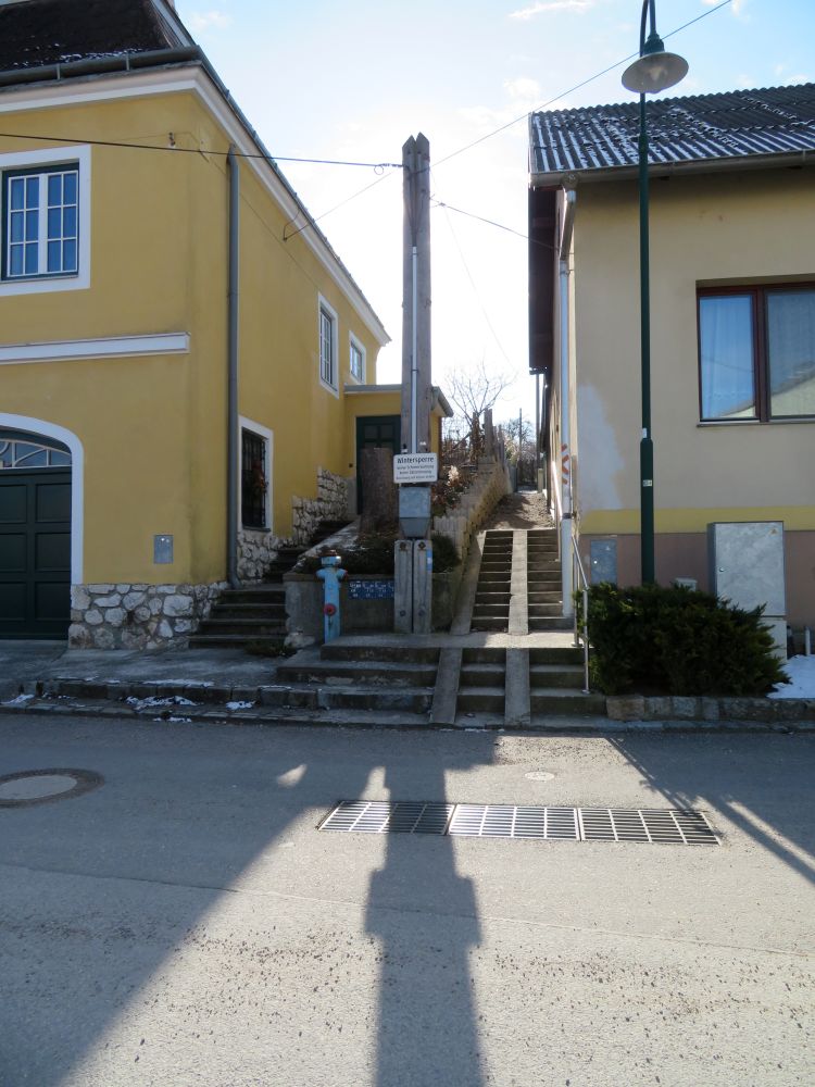 Von hier aus schreiten wir entlang der Kaiser Franz Josef Straße ostwärts und zweigen rechterhand bei einem schmalen Gässchen (zwischen Nr. 12 und 14) ab und folgen jenem zum Augraben im Hintaus.
