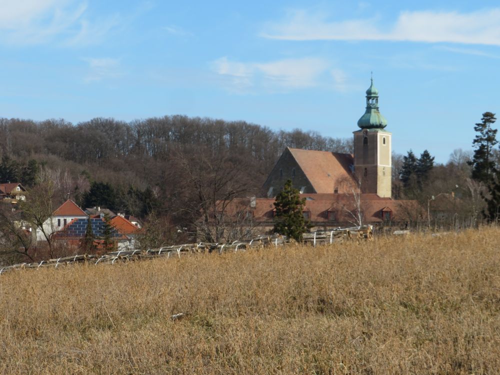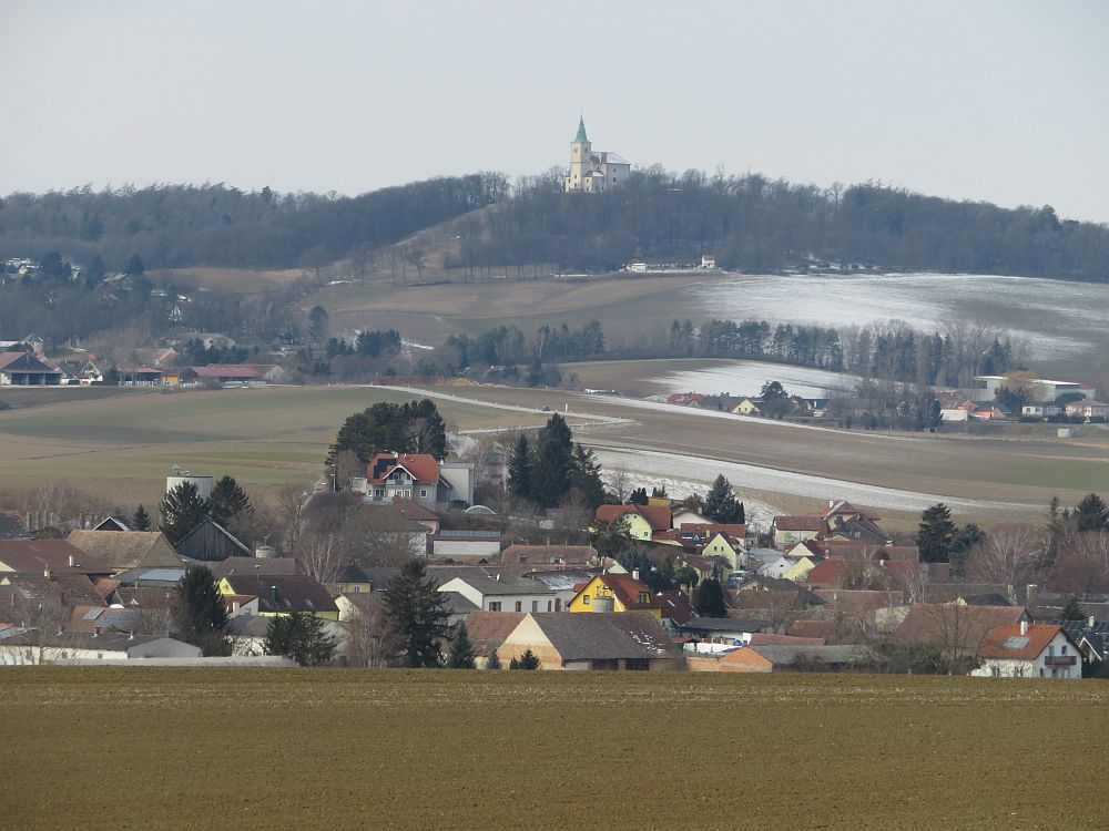 Blick über Weinsteig, dahinter die Bergkirche von Karnabrunn: