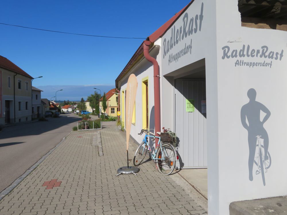 Von hier aus schreite ich entlang der Oberen Hauptstraße, vorbei an einer Radlerrast...