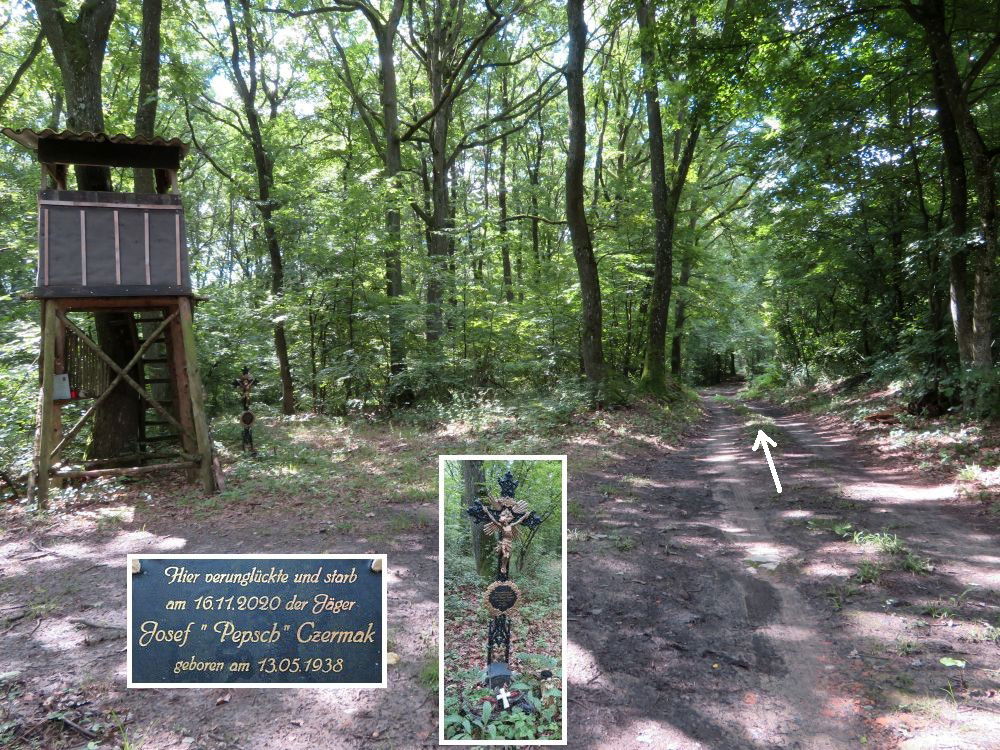 Hier, in einem Kreuzungsbereich, steht ein Gedenkkreuz eines sehr bekannten Jägers der Umgebung.