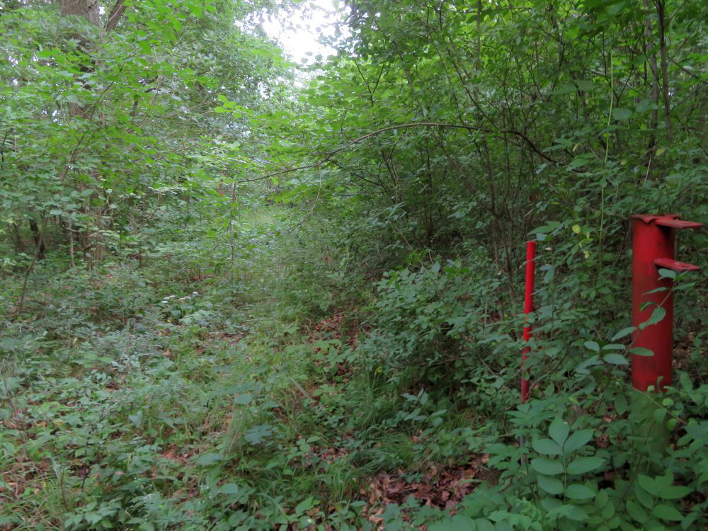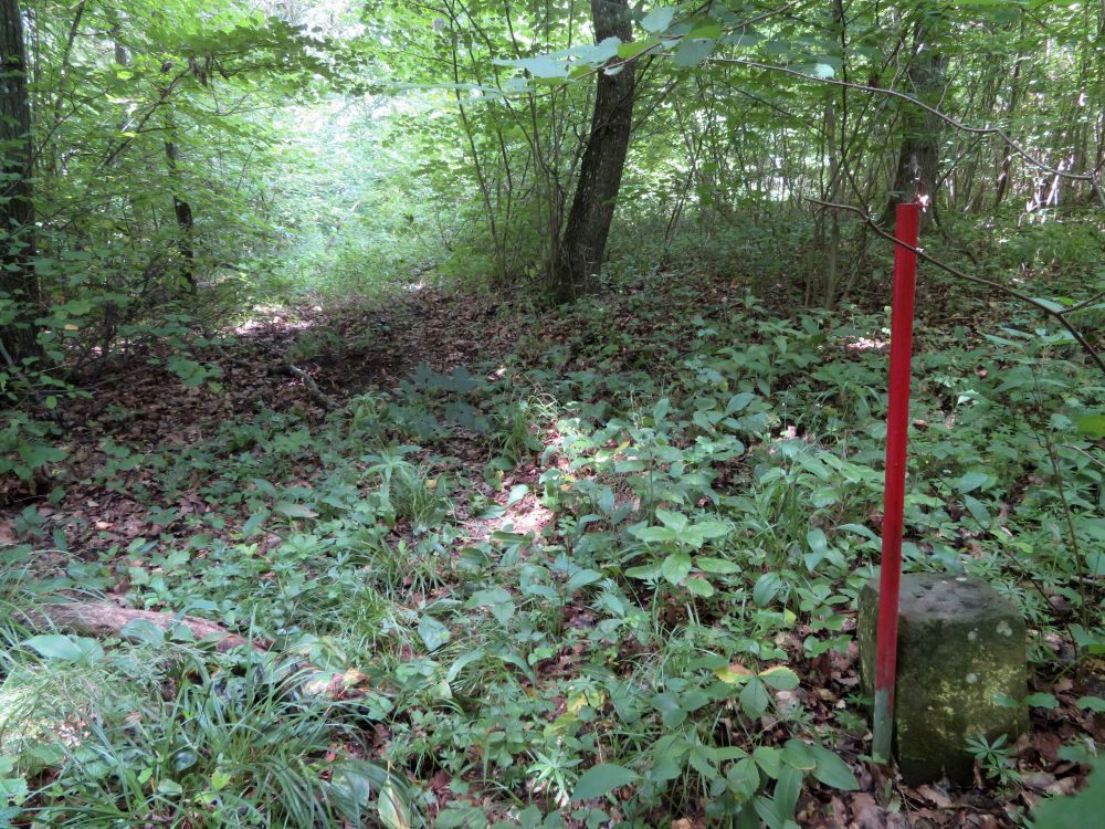 Bei zwei Grenzpflöcken am Wegesrand zweigt der Grenzweg rechts ab.