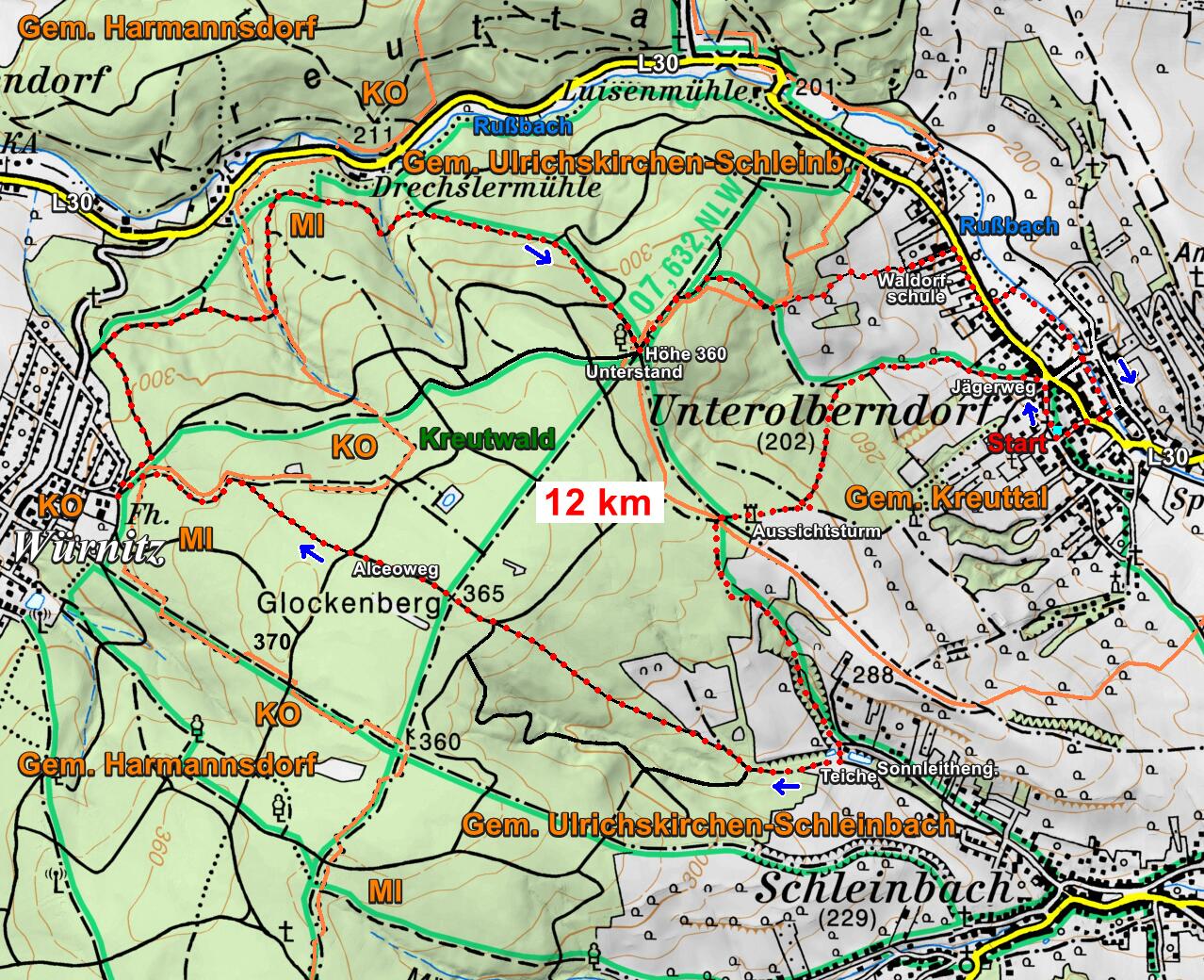 ...zweigen wir rechts ab folgen dem Weg für längere Zeit geradeaus auf den Glockenberg hinauf.