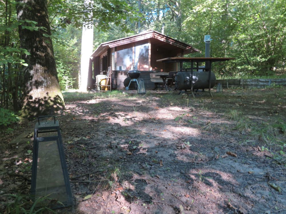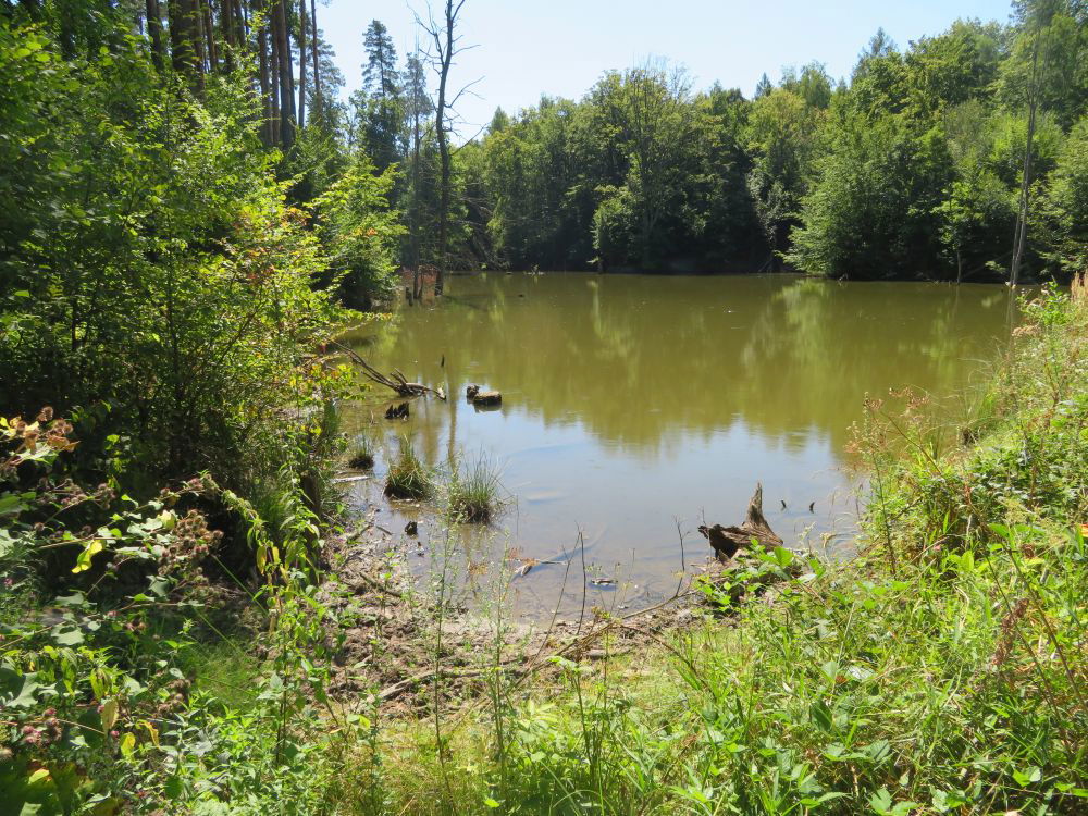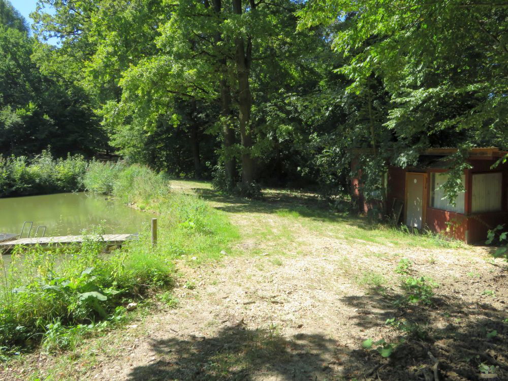 Kurz vorm Waldrand zweige ich rechts ab und komme im Graben an einer Jagdhütte bei einem weiteren Teich vorbei.