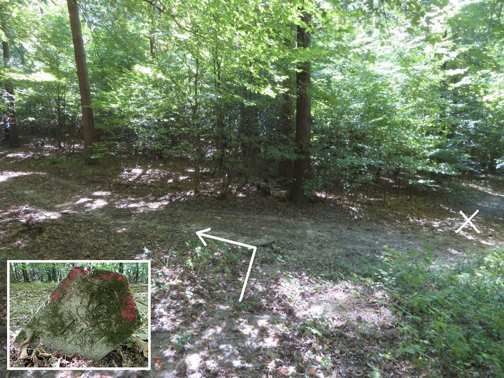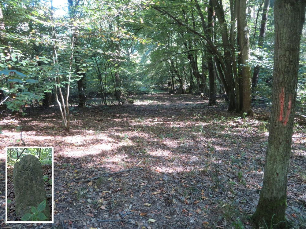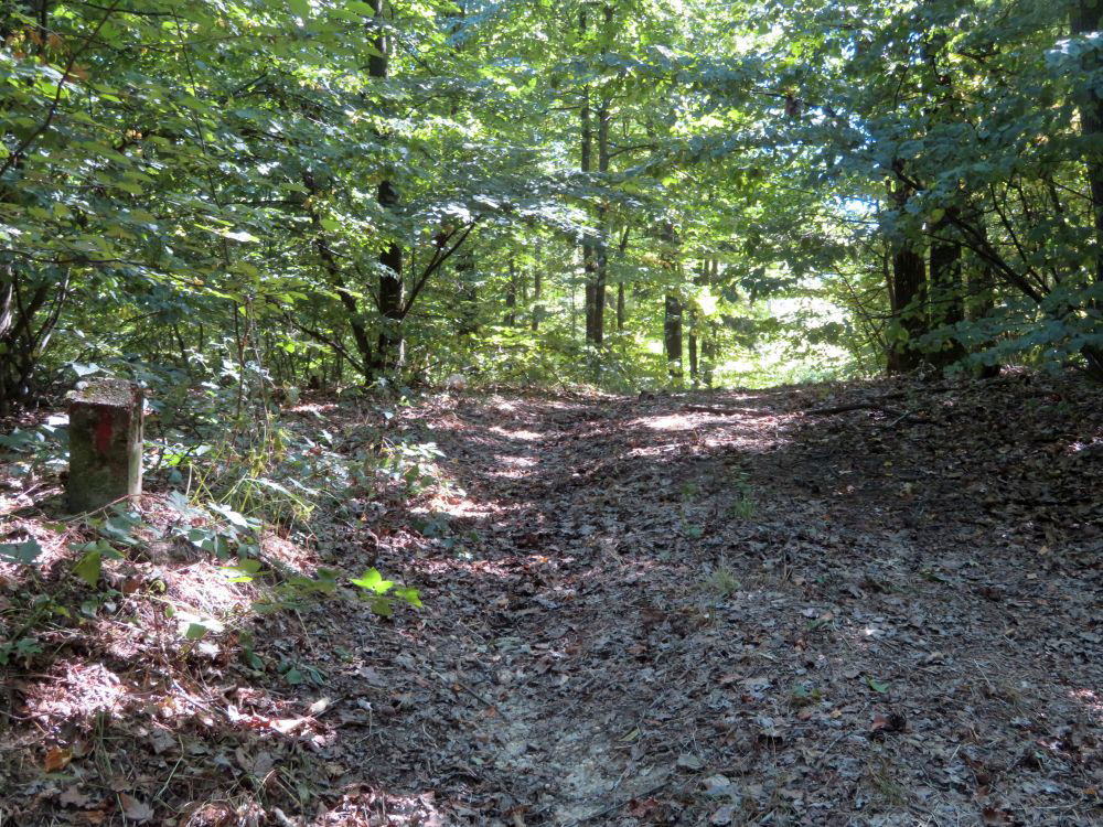 Rechtsseitig geht es entlang einer Schneise (vorbei an alten Grenzsteinen) in eine Senke hinab.