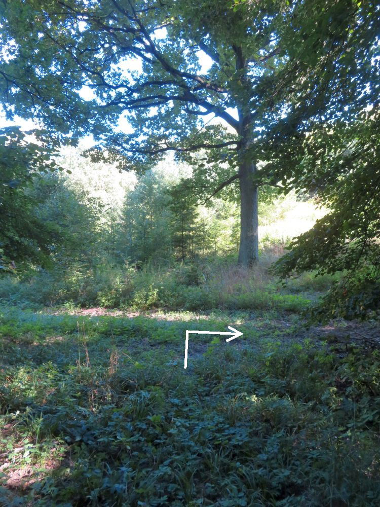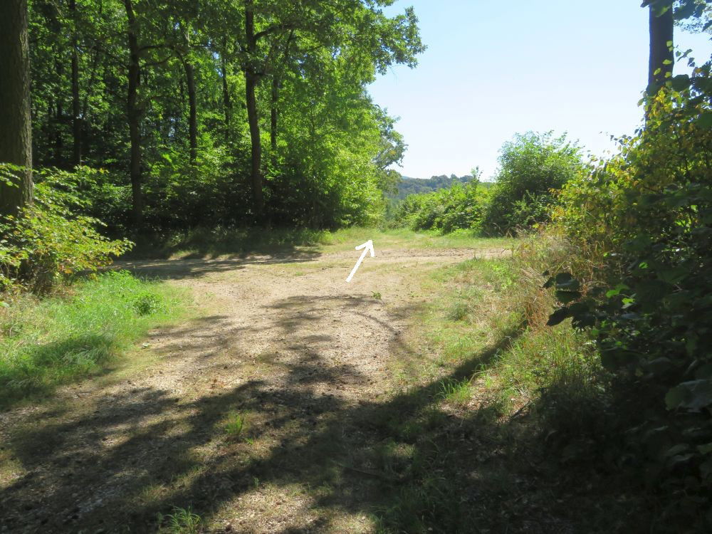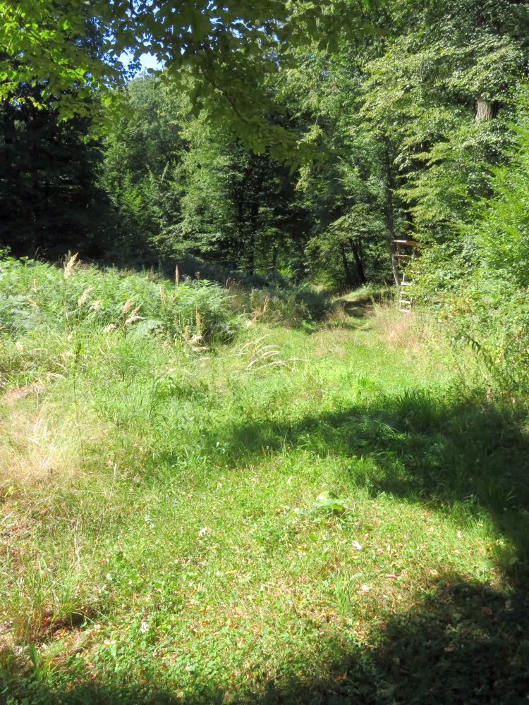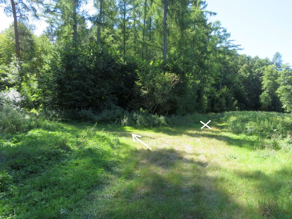Am Ende der großen Lichtung geht es rechtsseitig in eine Senke hinab.