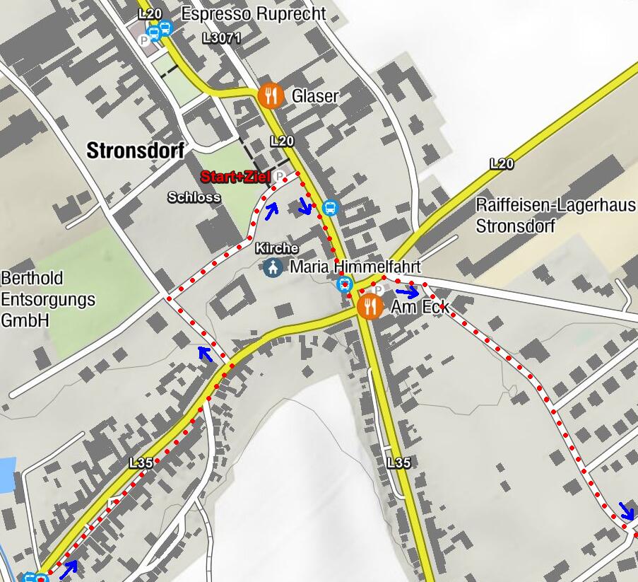 Nach dem Hirschenbergstadion gelangt man an die L35, welcher in die Ortsmitte gefolgt wird.
