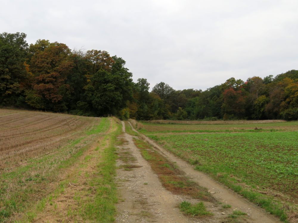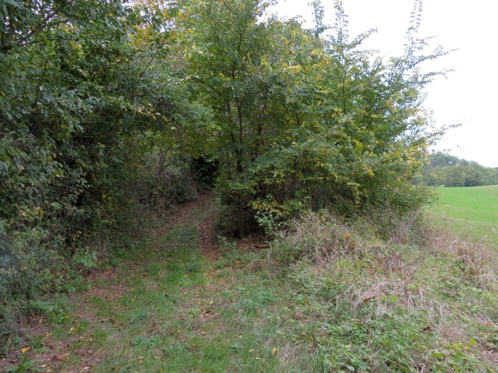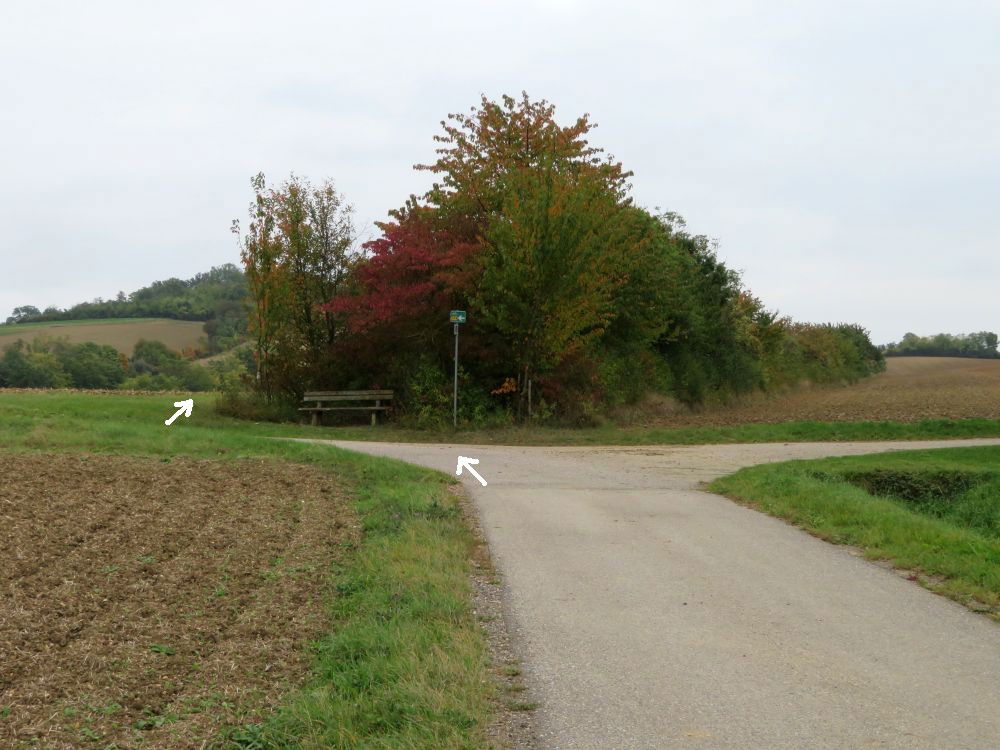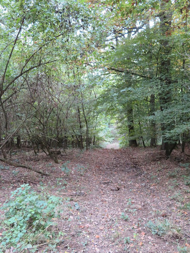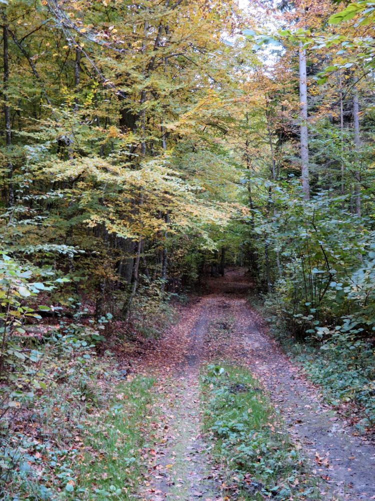 Durch den Wald hindurch bis zu einem querenden Weg an der Gemeindegrenze.