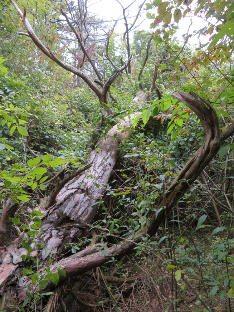 Der Gipfel befindet sich abseits des Weges unter einem umgestürzten Baum.