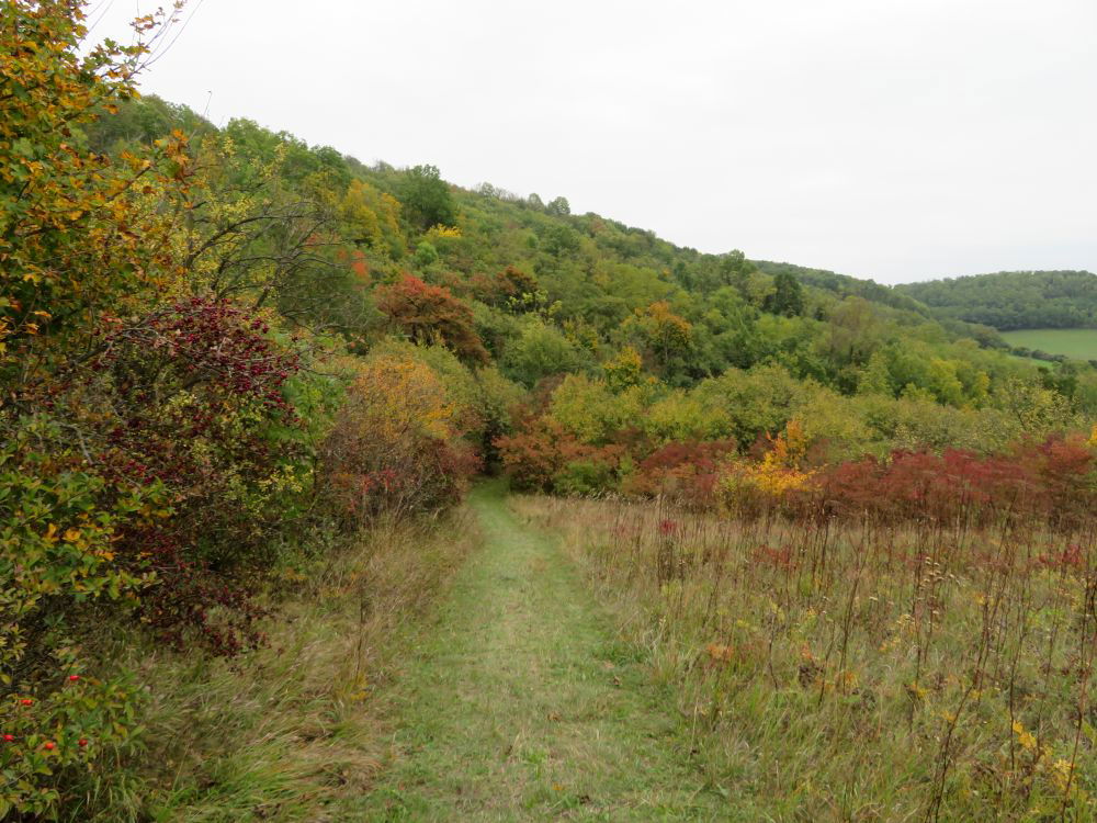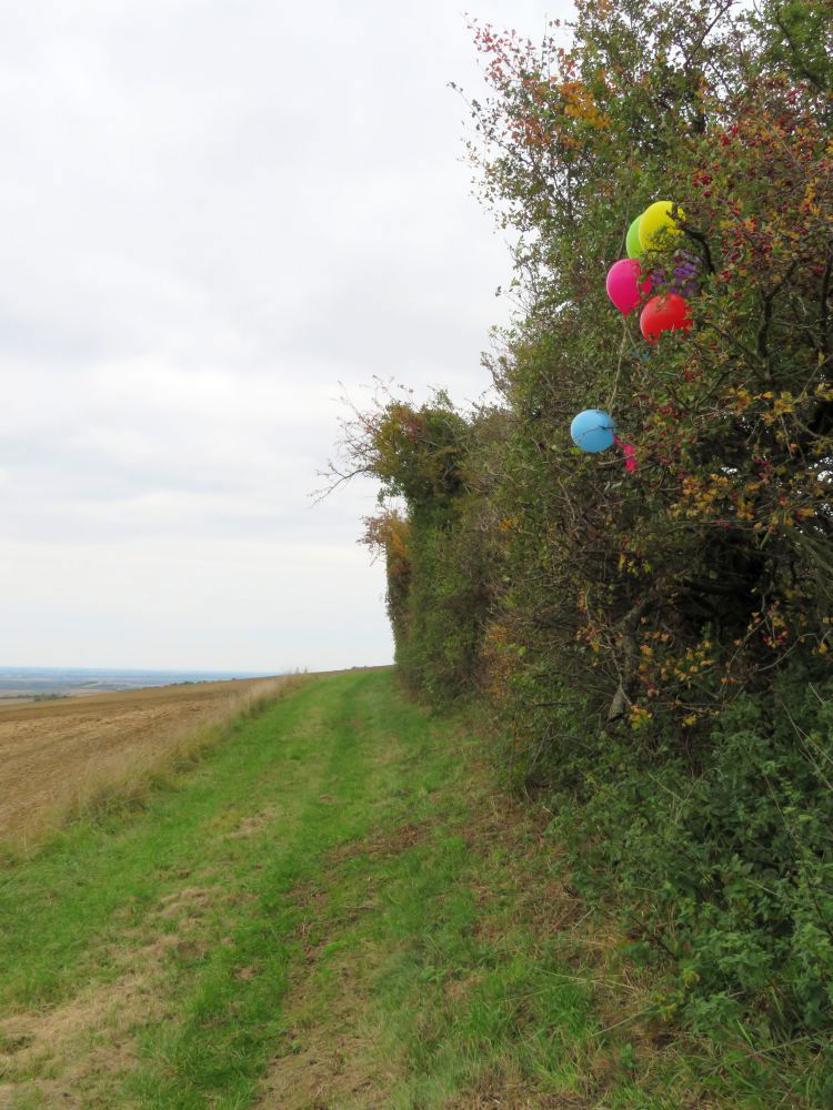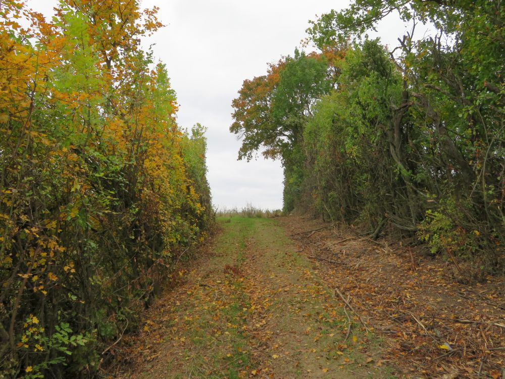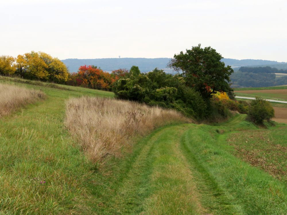 Entlang einer Buschzeile führt der Weg auf eine Anhöhe hinauf.