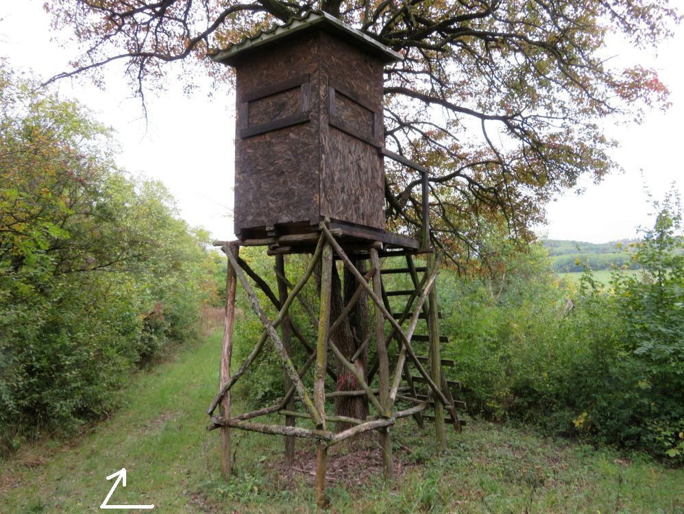 Also, erst geht es linksseitig bis zu einem Hochstand und dort entlang eines Waldweges zum höchsten Punkt empor.