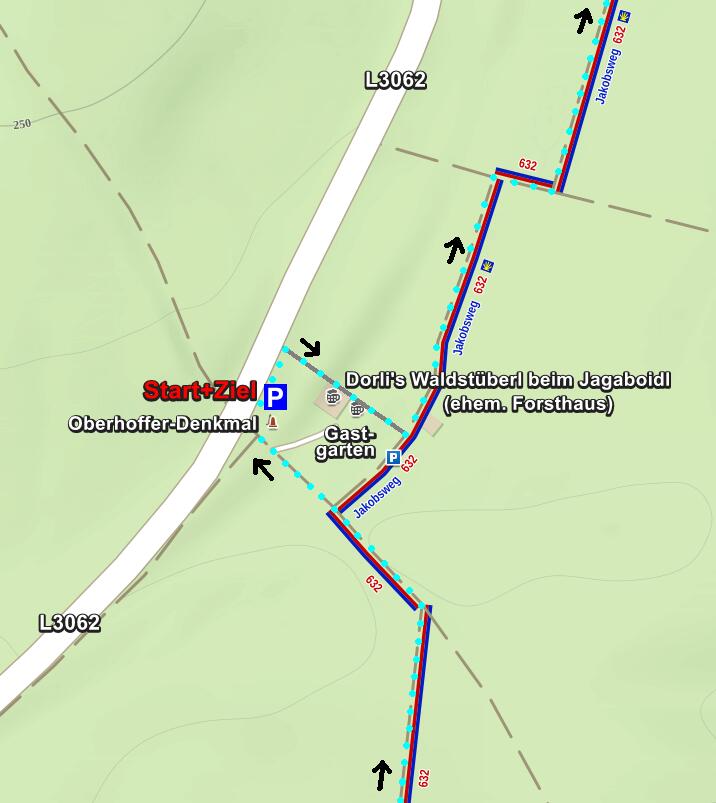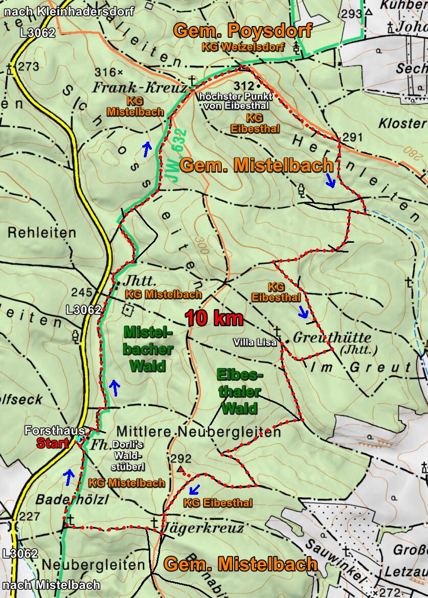 Start und Ziel: Nördlich der Stadt im Mistelbacher Wald beim ehemaligen Forsthaus "Jagaboidl" (an der L3062 - Landesstraße nach Kleinhadersdorf).