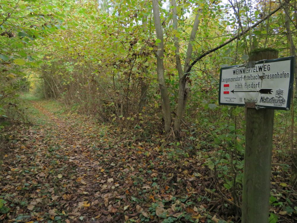 Weiter durch den Wald zum querenden Grenzweg (Katastralgemeindengrenze zwischen Mistelbach und Eibesthal) empor: