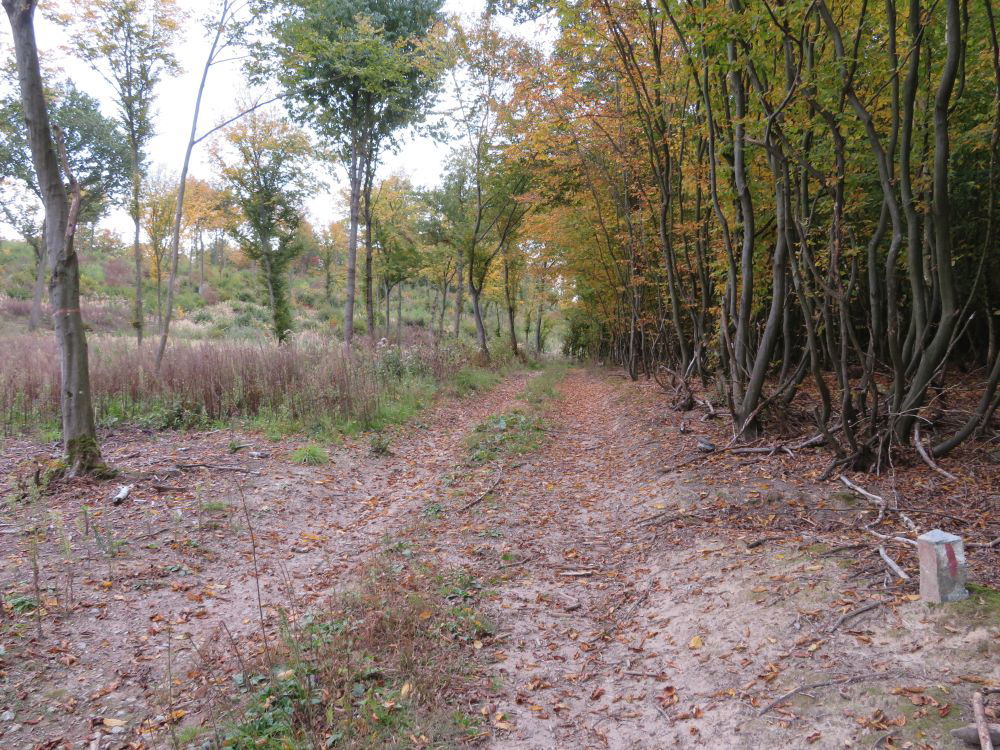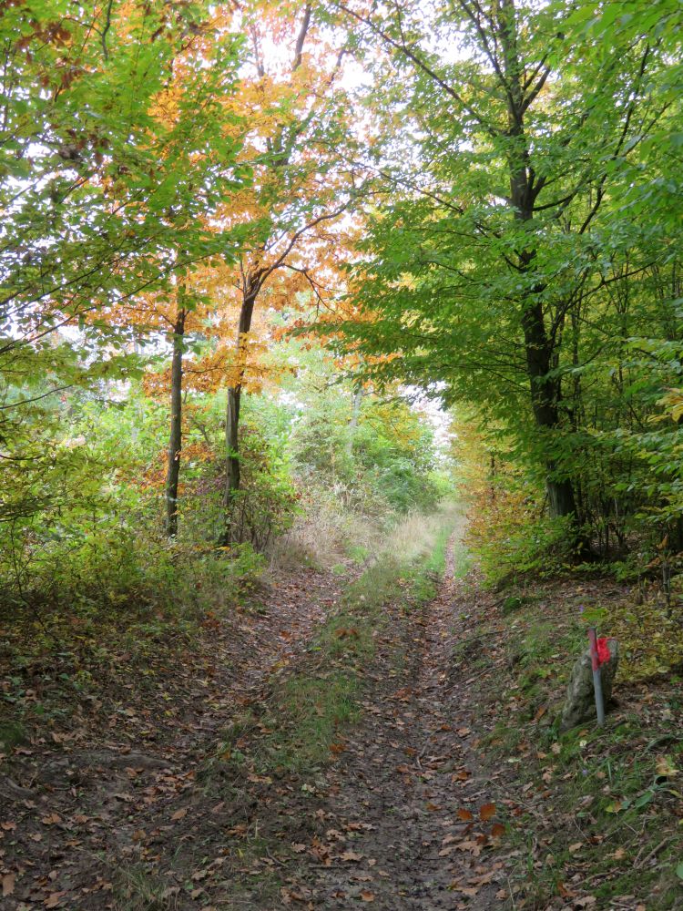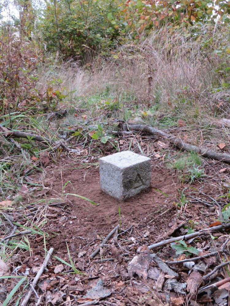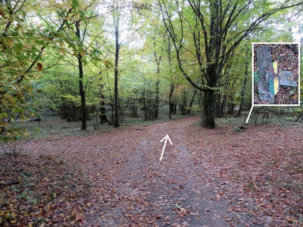 Danach geht es zum Grenzweg hinab und bei einer Wegkreuzung mit umgefallenen Grenzstein geradeaus weiter.