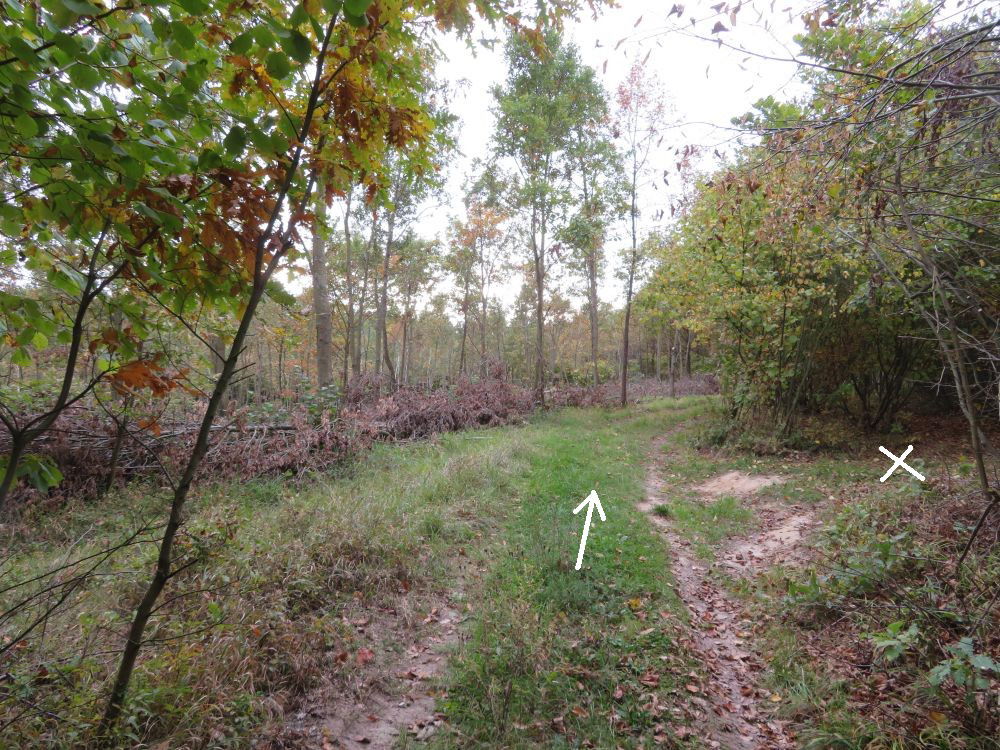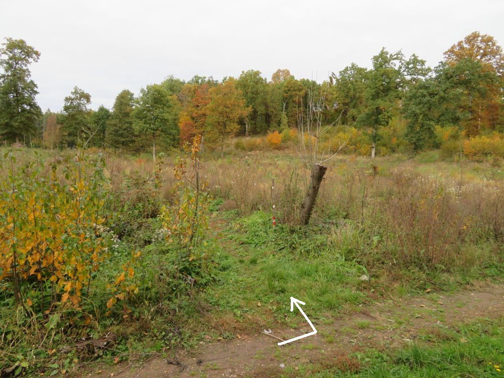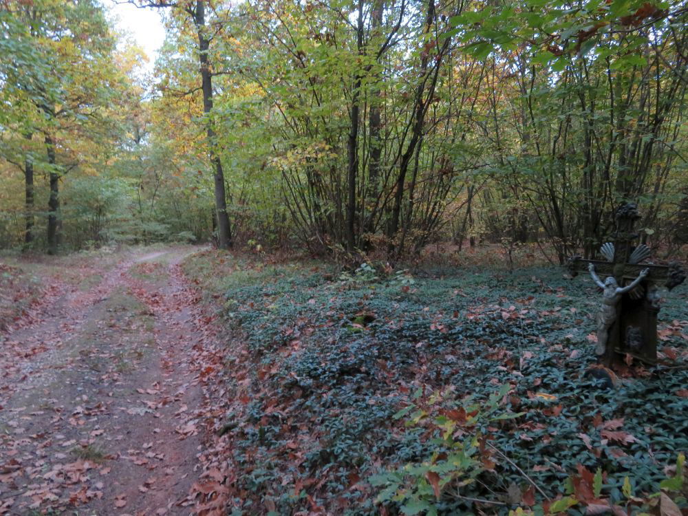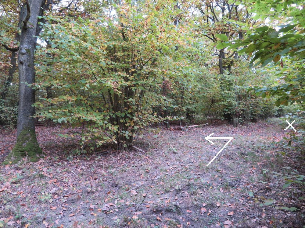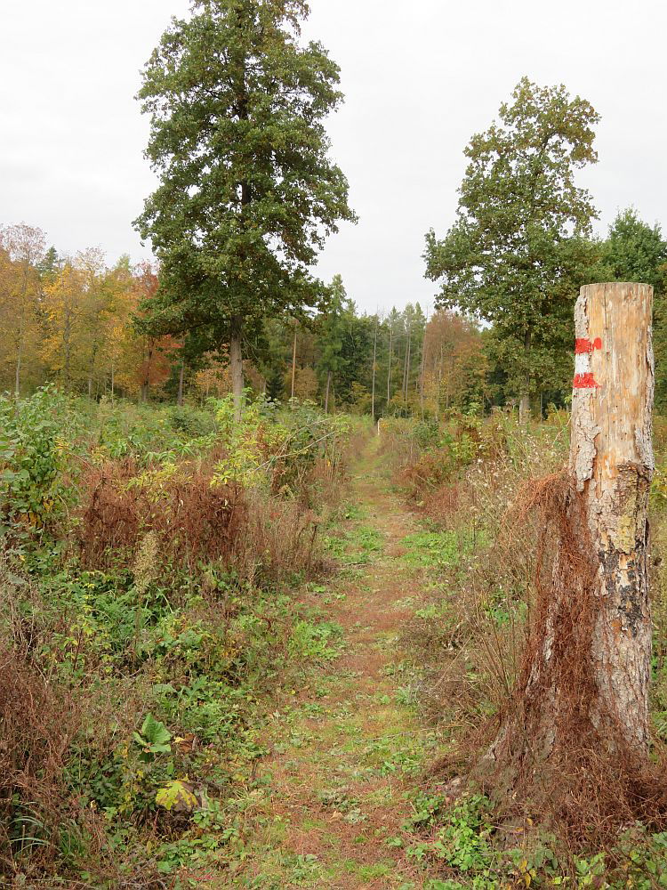 Danach geht es zum Grenzweg hinab und bei einer Wegkreuzung mit umgefallenen Grenzstein geradeaus weiter.