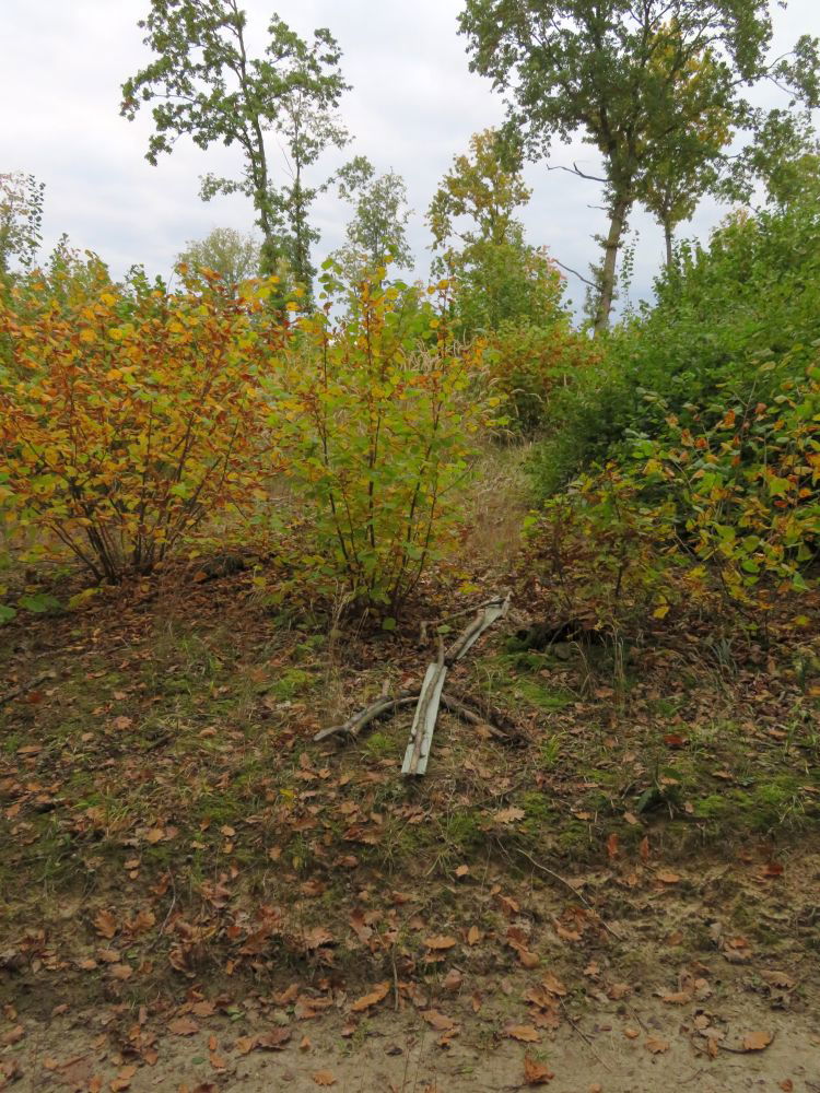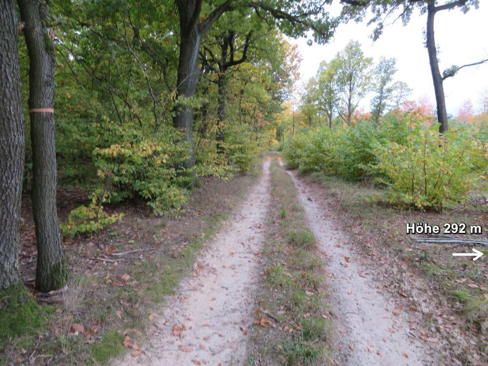 Dem Fahrweg auf eine Anhöhe gefolgt und kurz nach der Kuppe weglos auf Steigspuren zum Vermessungsstein der Höhe 292 m "geruachelt":