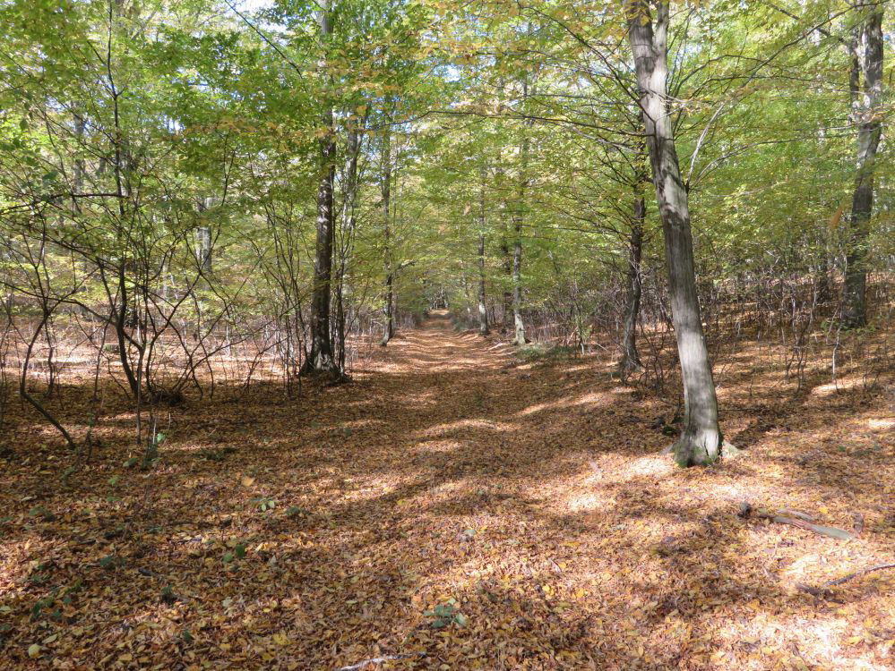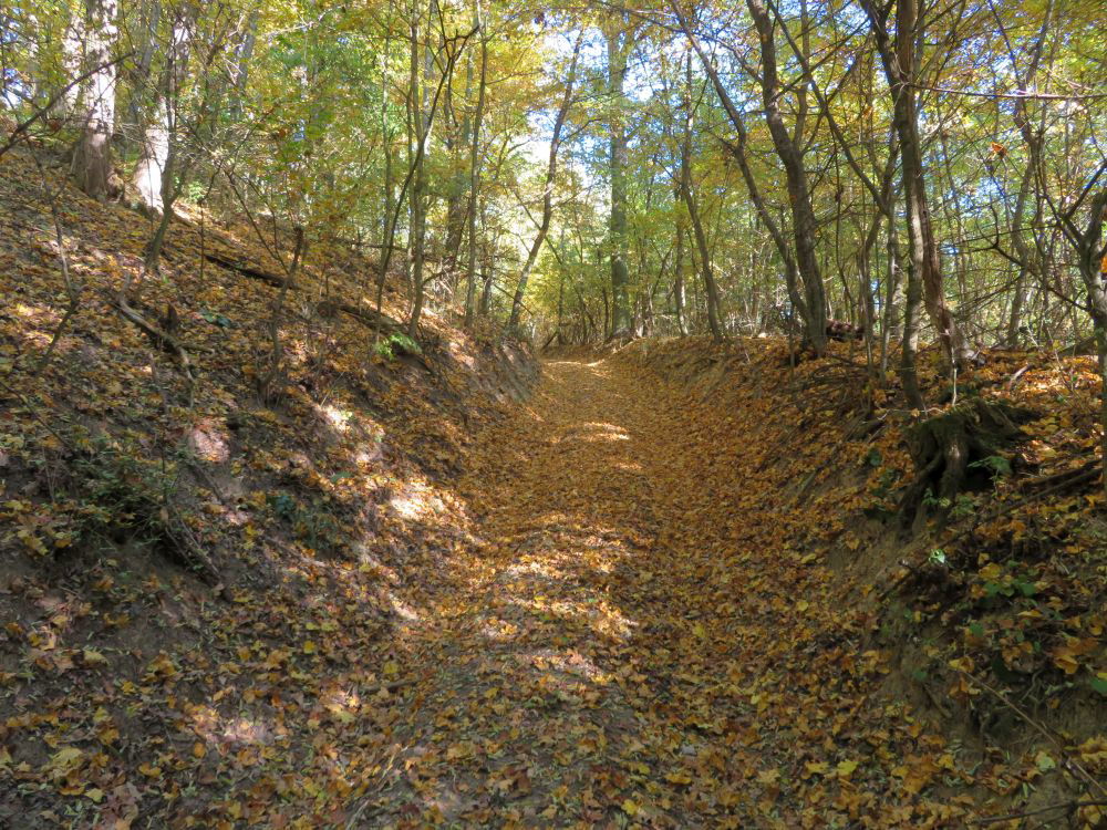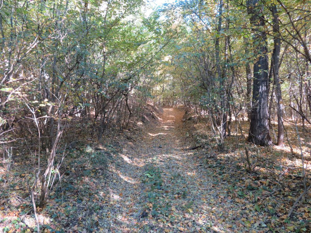 Der Weg führt in eine Senke zu einer Lichtung hinab.