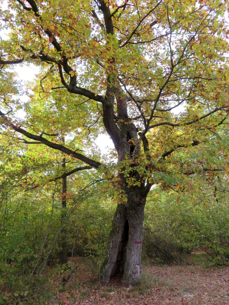 Vorbei an einer hohlen Eiche am Wegesrand in ca. 100 m Entfernung: