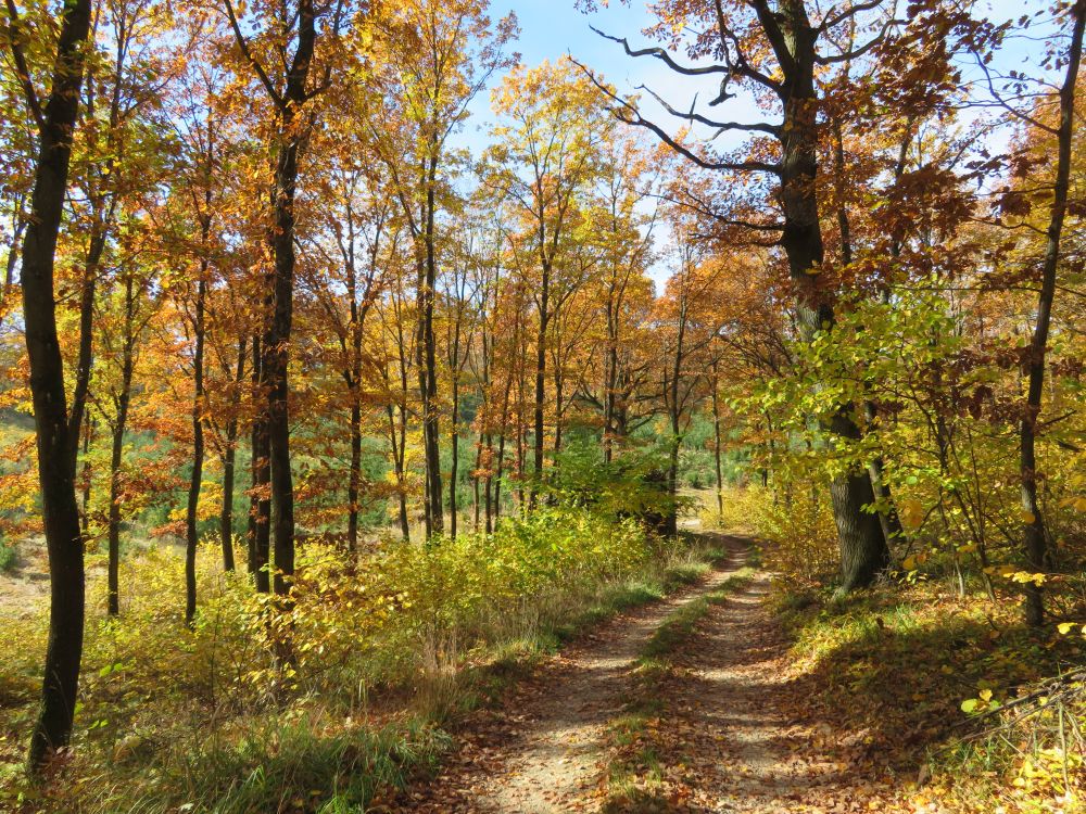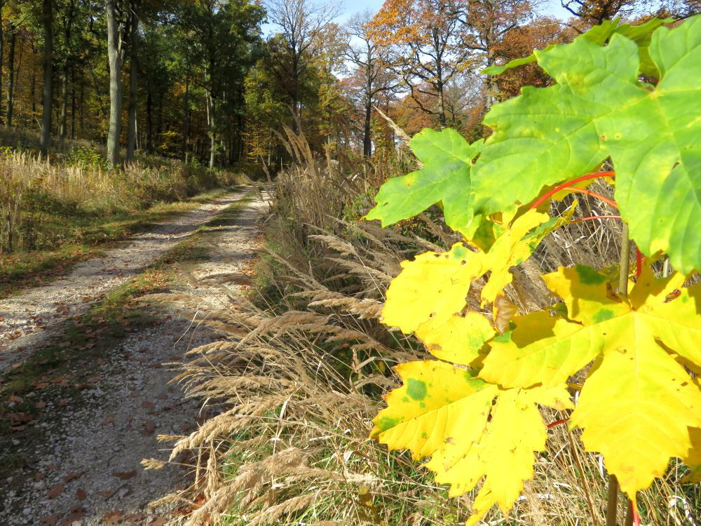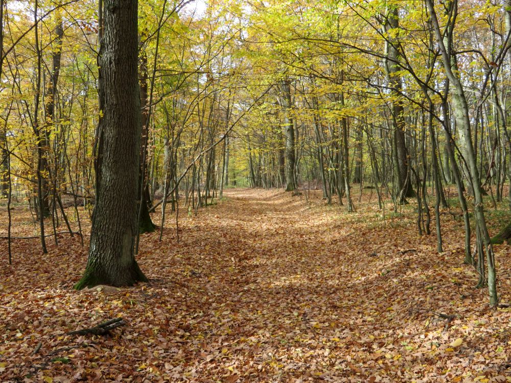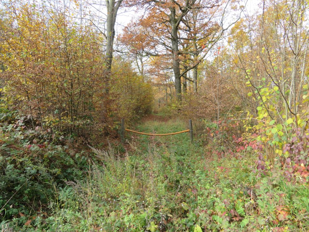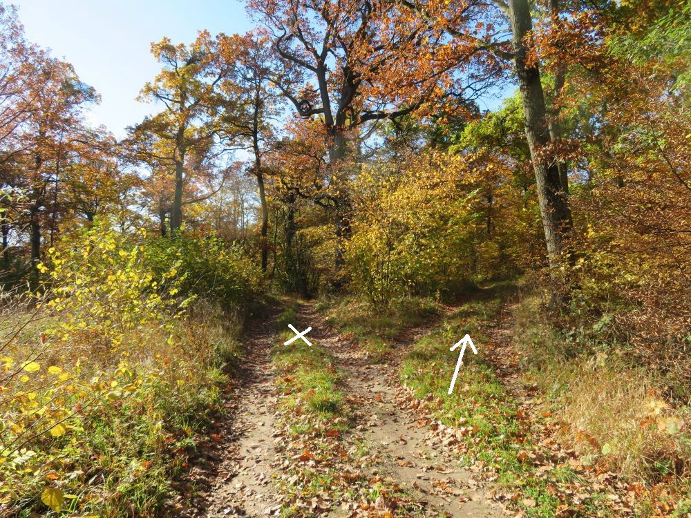 Bald zweigt ein Weg links ab und führt in ein Waldstück hinein und hindurch.