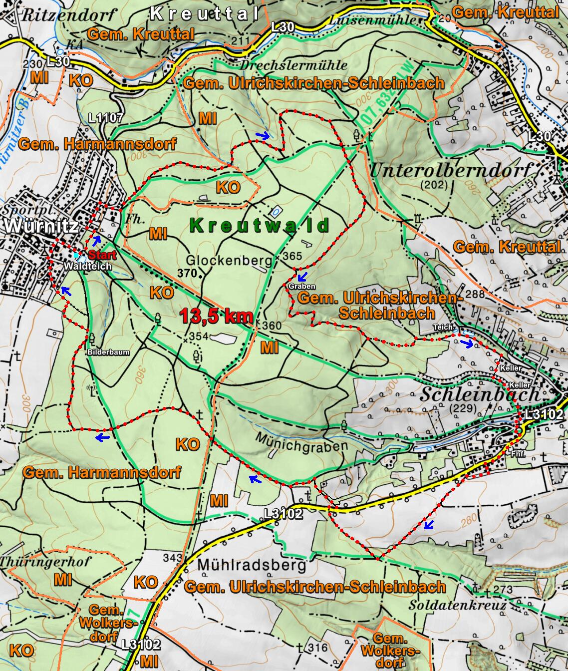 Danach gelangen wir am Ortsrand wieder zur L3102 (Mühlratzstraße), wo wir linksseitig abzweigen und einem Weg zum Mühlradsberg-Wald hinüber folgen.