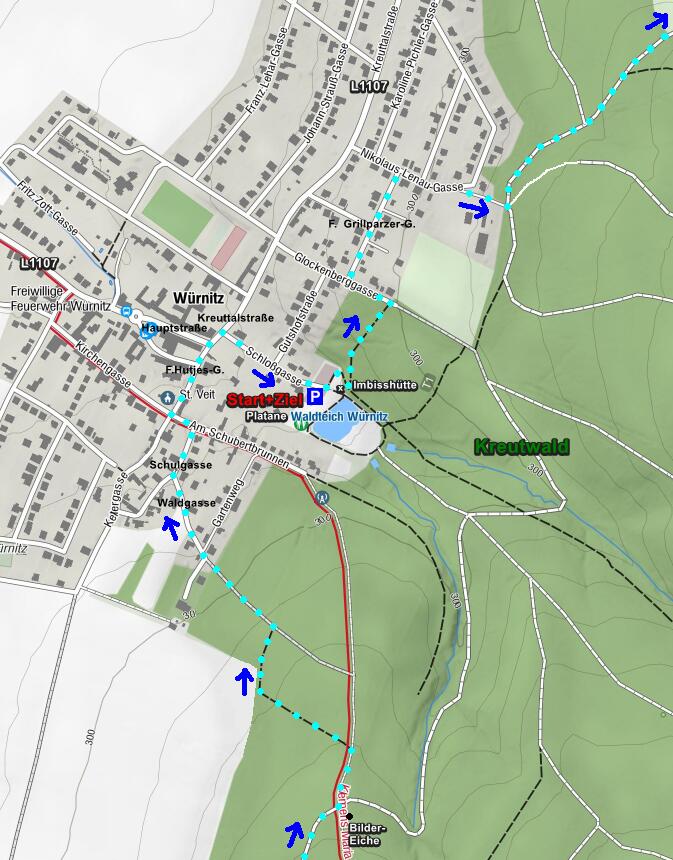 Danach der Franz Hutjes-Gasse bis zur Schloßgasse folgen und entlang jener zum Ausgangspunkt beim Waldteich schreiten.