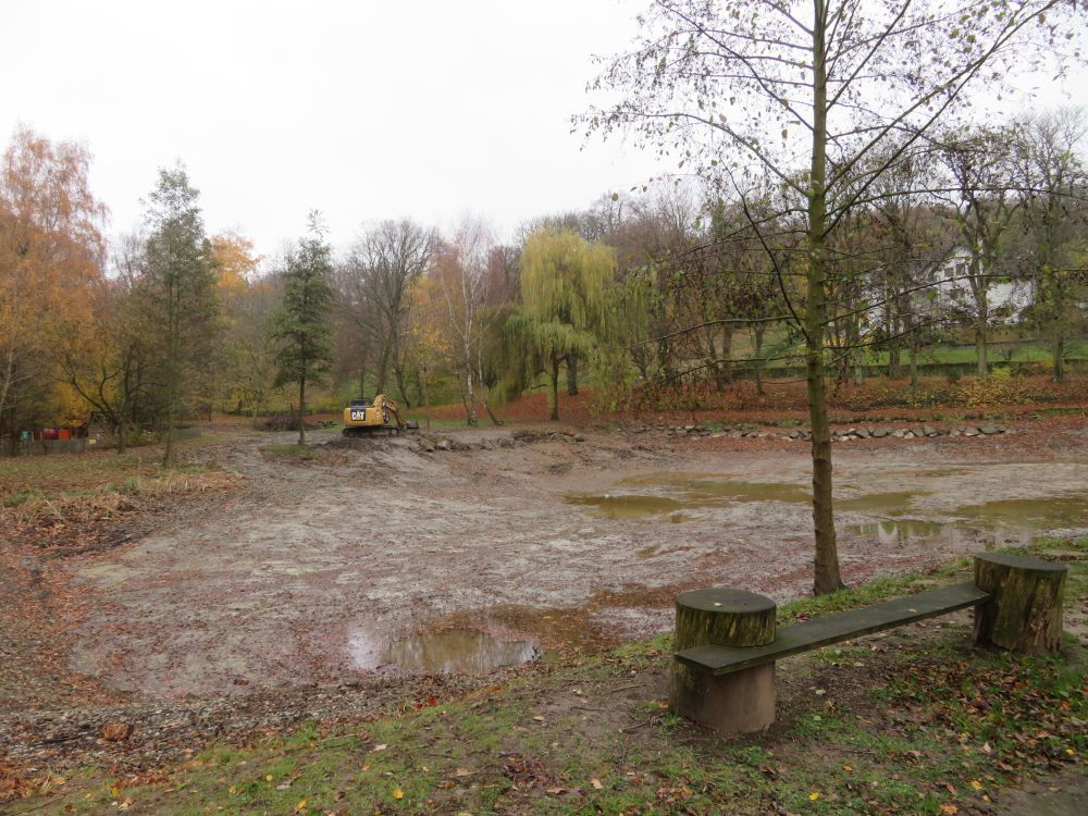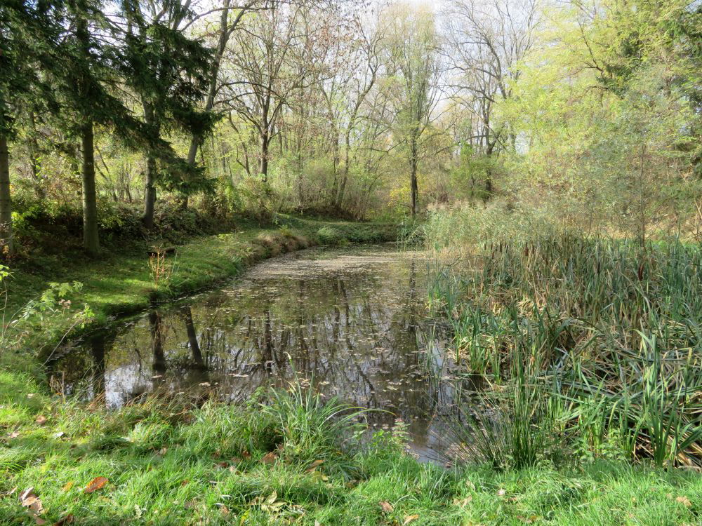 Von hier aus schreiten wir, vorbei an der Imbisshütte, zum nahen Waldteich.