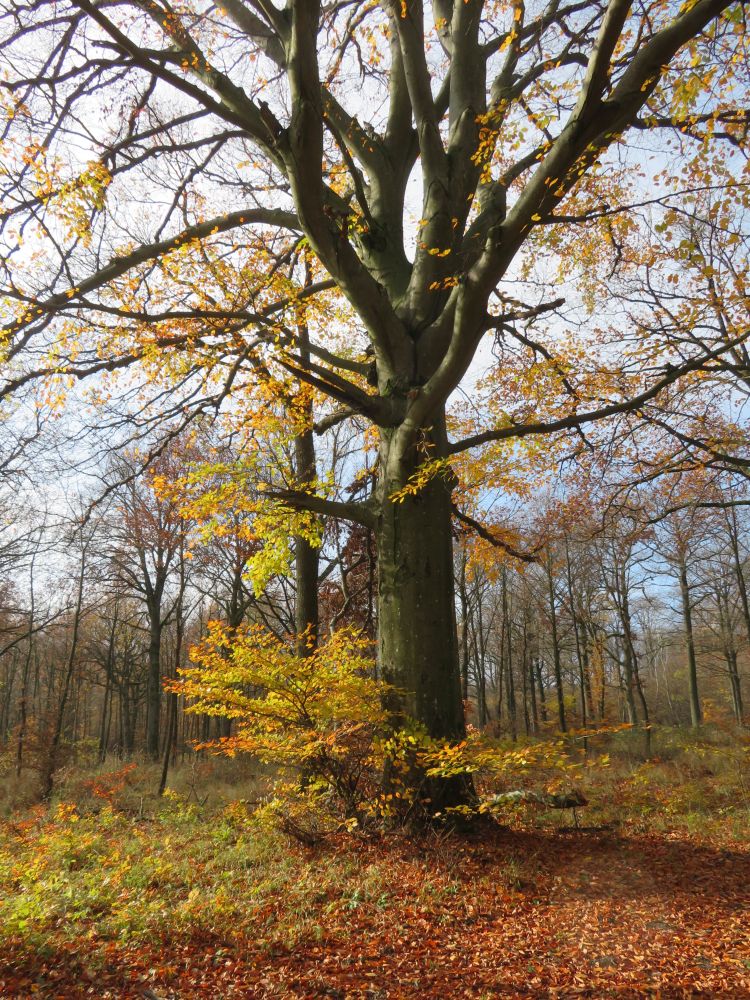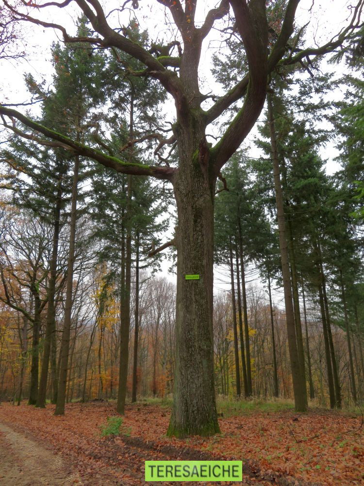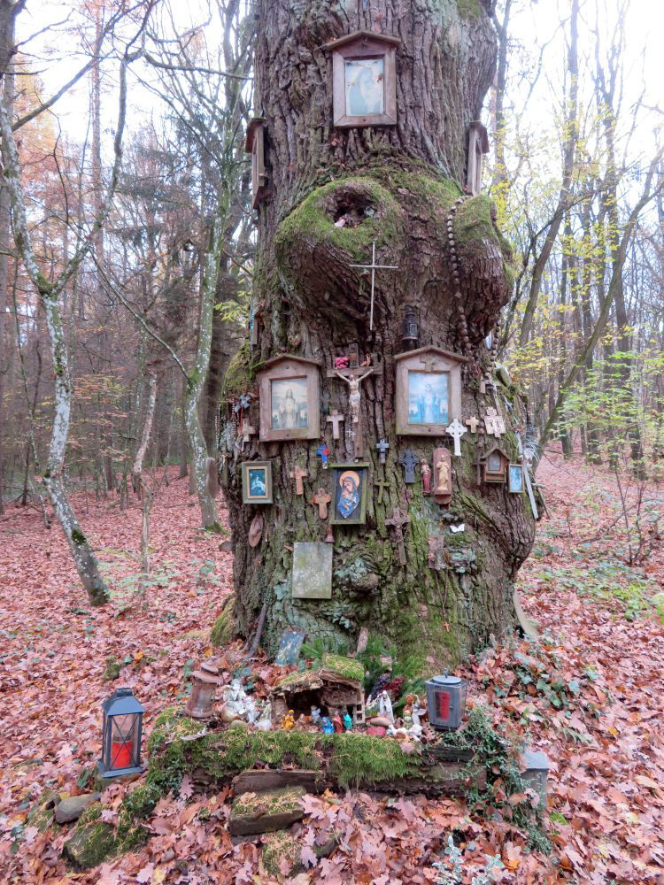 Vorbei an einem Bilderbaum bei einem querenden Wanderweg:
