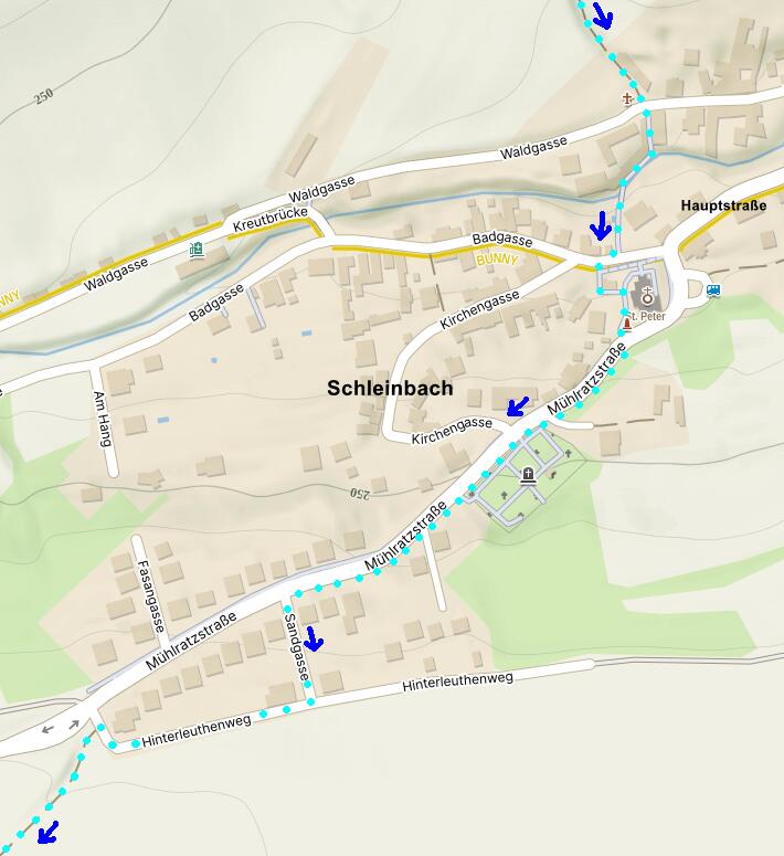Nach dem Friedhof zweigen wir links ab und folgen der Sandgasse zum Hinterleuthenweg empor.