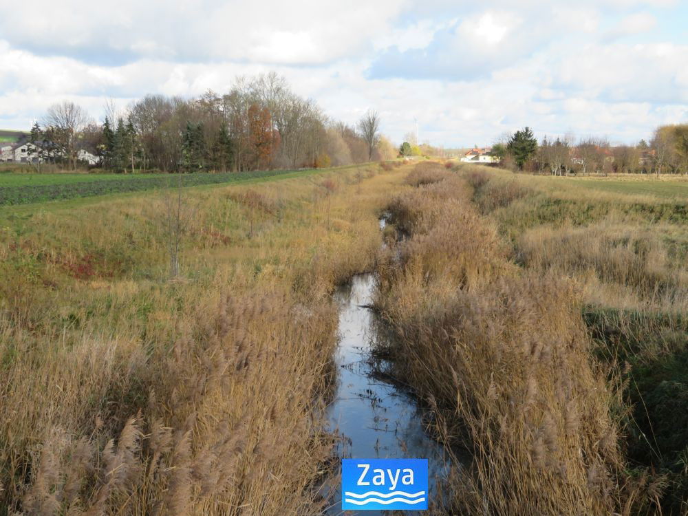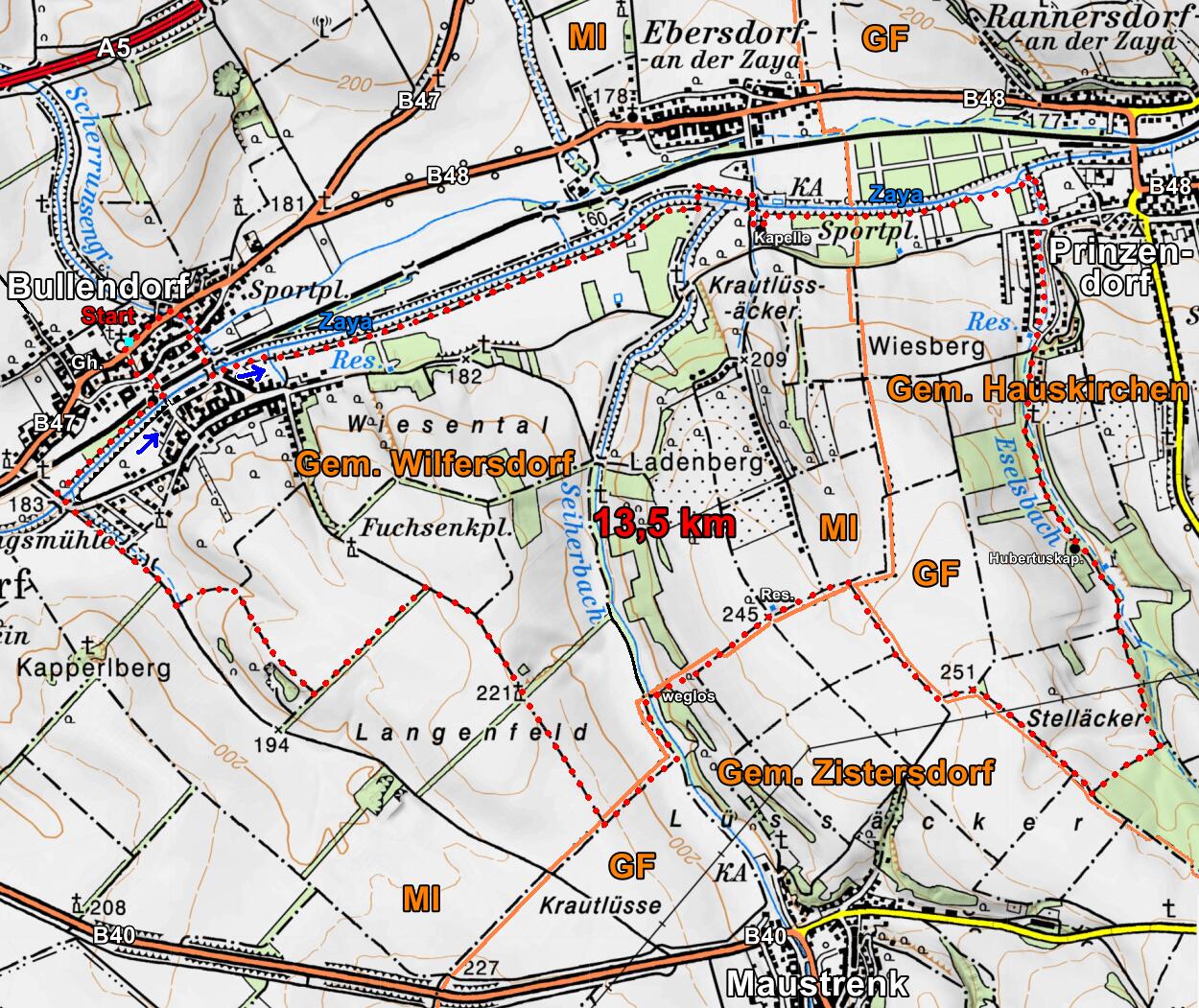 Dort wechsle ich bei der Feuerwehr die Bachseite , quere die Bahntrasse und die Zaya.