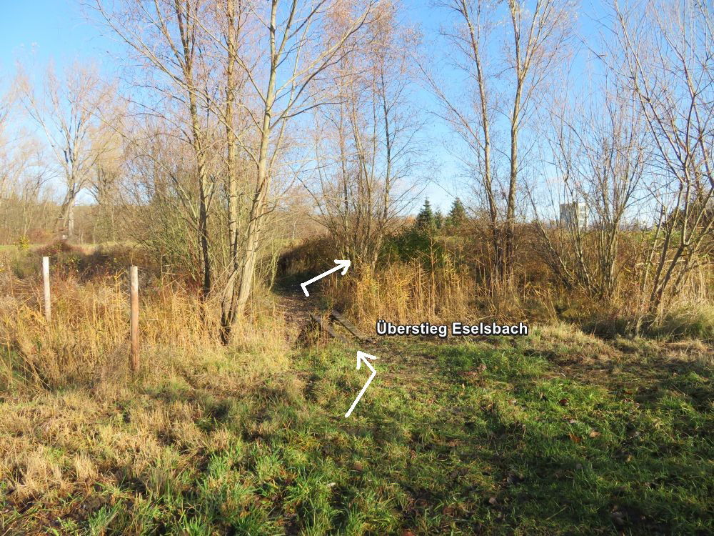 Der querende, einmündende Eselsbach wird linksseitig überstiegen, danach steigt man die Böschung empor...
